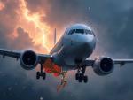 Superman intercepts a plummeting airbus A220-100 airplane flying through a fierce hailstorm.