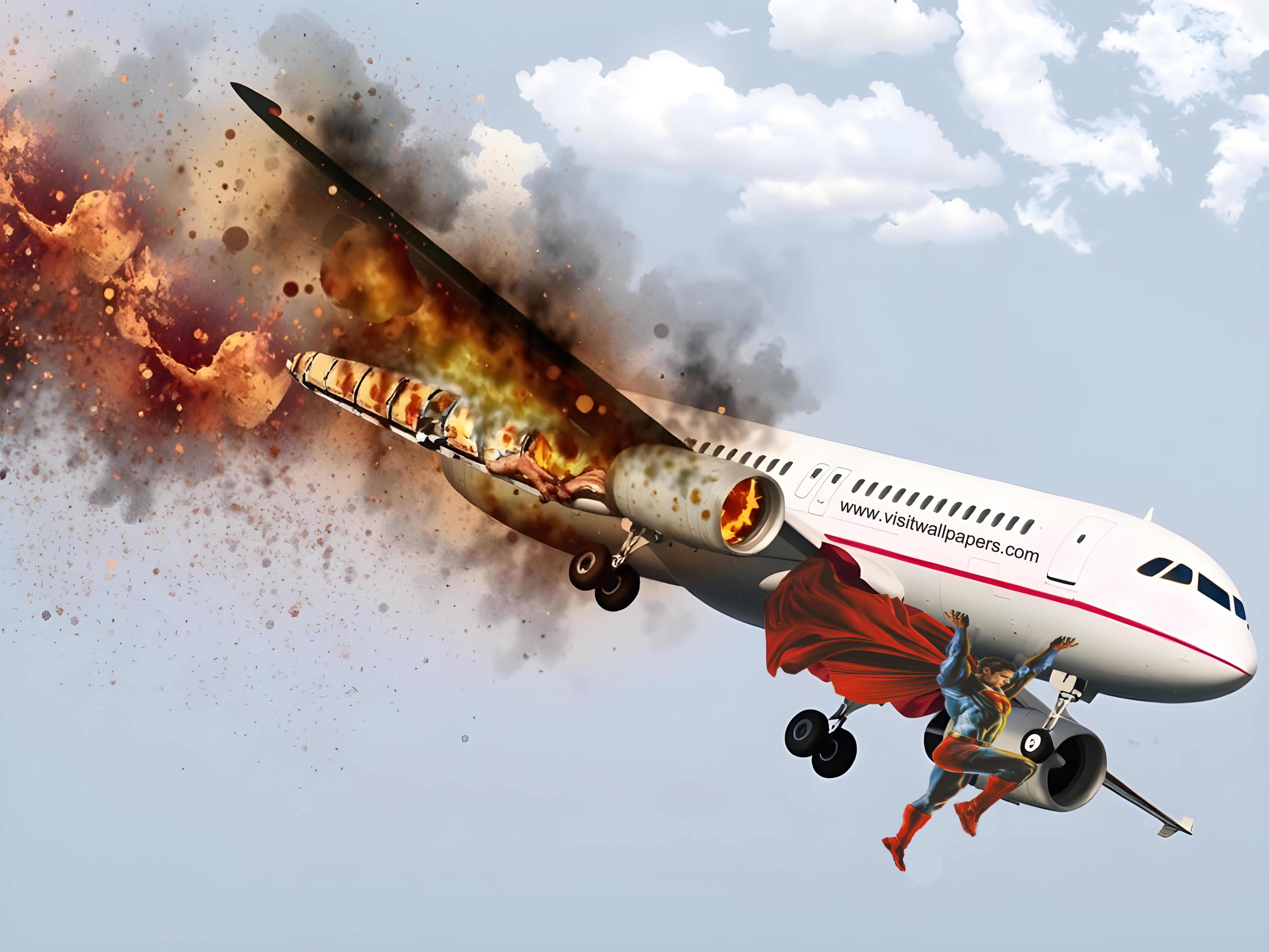 Superman intercepts a plummeting commercial plane with flames engulfing the fuselage, effortlessly lifting it with superhuman strength, guided by precise control.