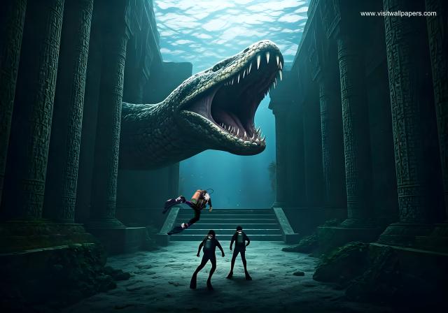 Ancient sea serpent and a group of divers exploring underwater with mysterious underwater ruins in the background.