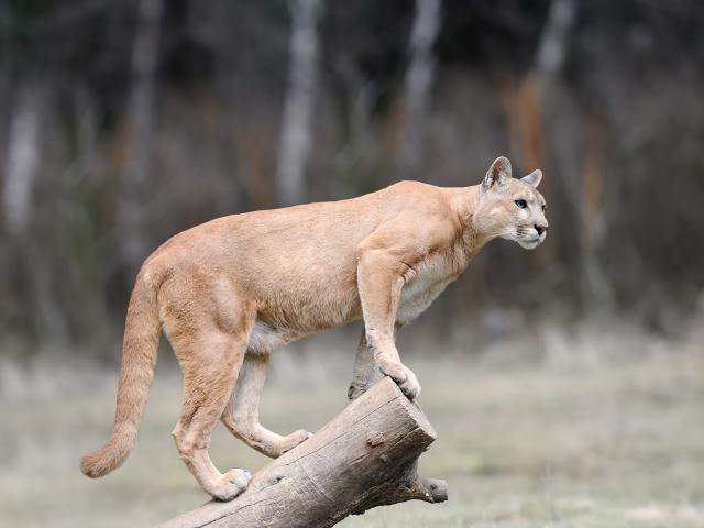 Cougar_16COUGAR MOUNTAIN LION PANTHER Cougar also called Mountain Lion, Panther or Puma crossing a log at a frozen pond in winter, Colorado, USA