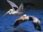 Birds_322Pelican flying over water in sunrise, Pelican in sunrise colors flying over a lake