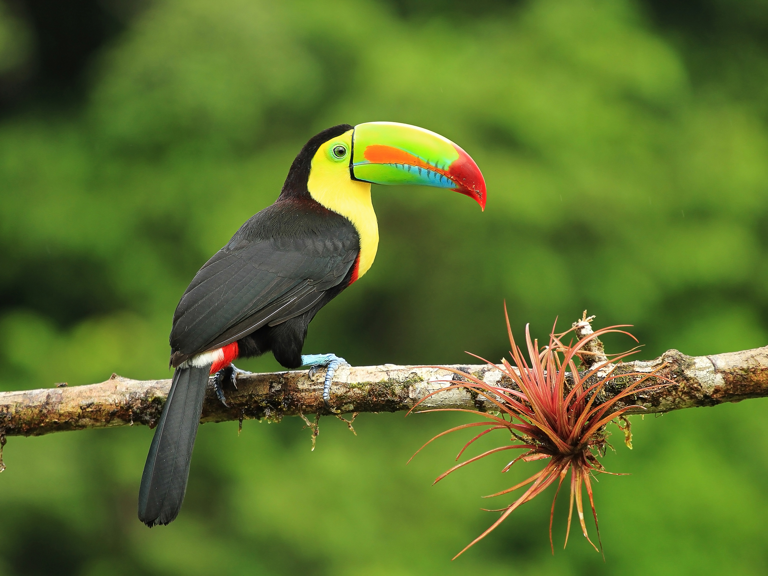 Birds_306Keel-billed Toucan, Ramphastos sulfuratus, bird with big bill. Toucan sitting on the branch in the forest, Boca Tapada, green vegetation, Costa Rica. Nature travel in central America.