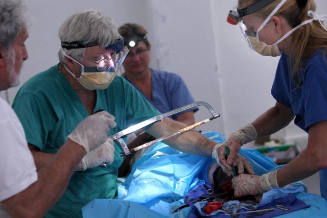 haiti_sixdayslater_016Georges Boutin of Fort Lauderdale, Florida (with hacksaw) and daughter (right) Pier Boutin of Lenox, Massachussets use a hacksaw to amputate a woman's leg in Port Au Prince General Hospital. It was the first surgery at the country's largest hospital since