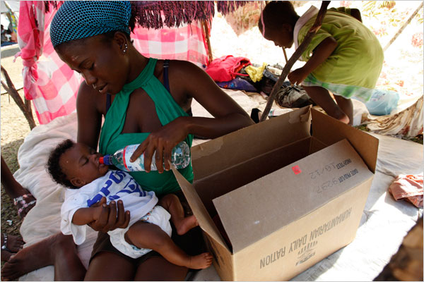 haiti_sixdayslater_040Quikani Alakassis, 21, gave her 4-month-old daughter, Kiana Jean Baptiste, water from a bottle distributed by soldiers with the 82nd Airborne as she sits in her makeshift shelter on the grounds of the Pétionville Club.