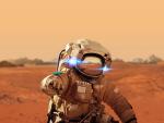 Astronaut around the crater with water.