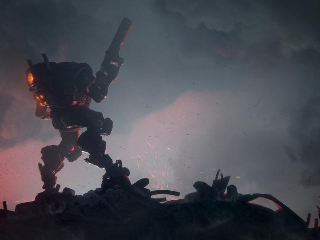 sci-fi_1343d illustration of an action scene of a sci-fi mech standing on the ruins of the city in an attacking pose with an assault gun in one hand against storm clouds. Apocalypse concept. Storm trooper robot