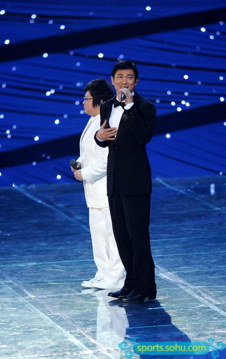 Chinese entertainers photoed with Fu Niu Lele during the closing ceremony of the 2008 Beij