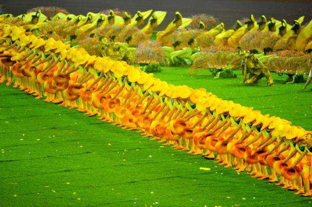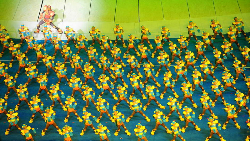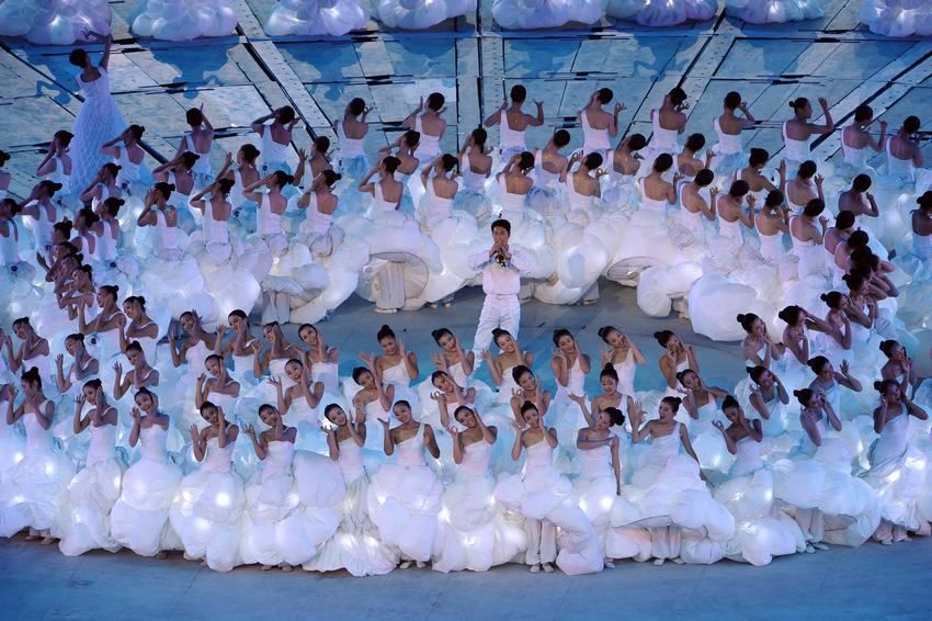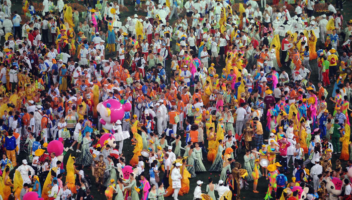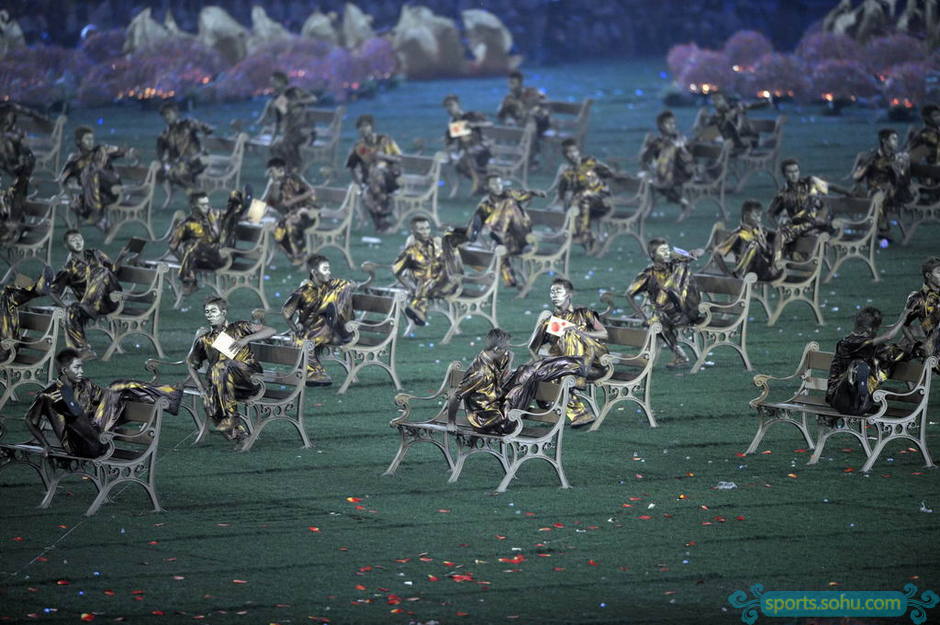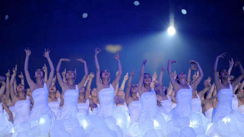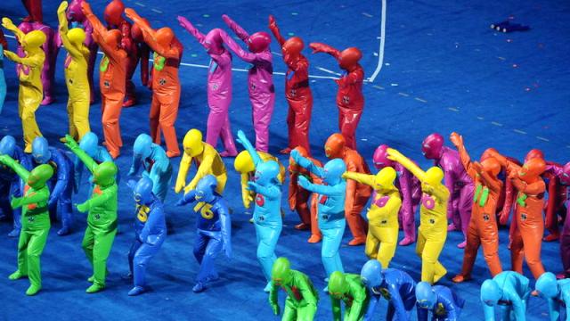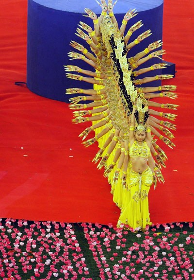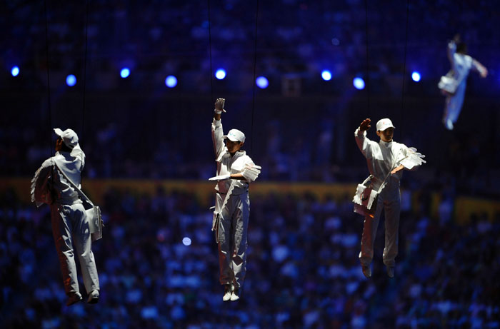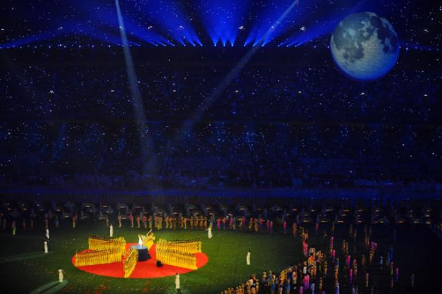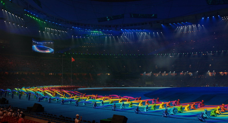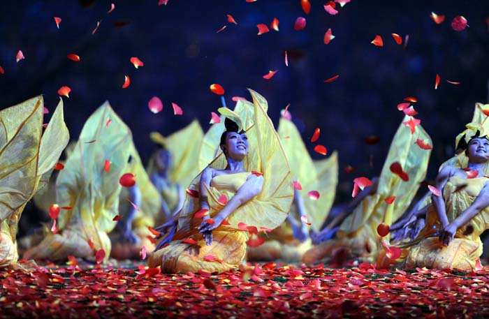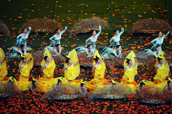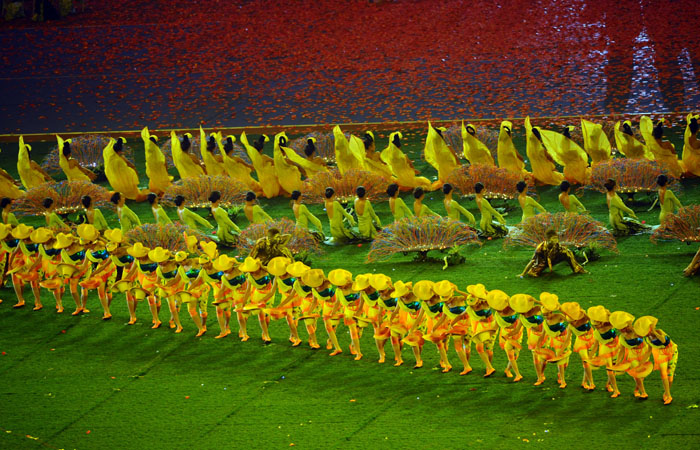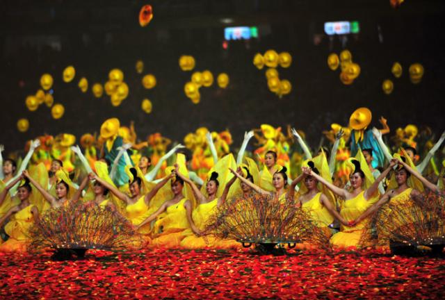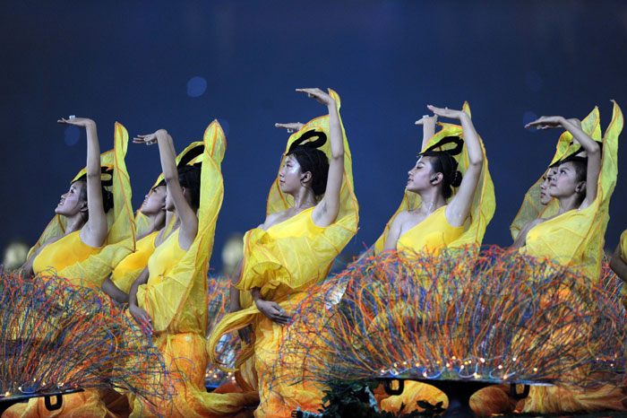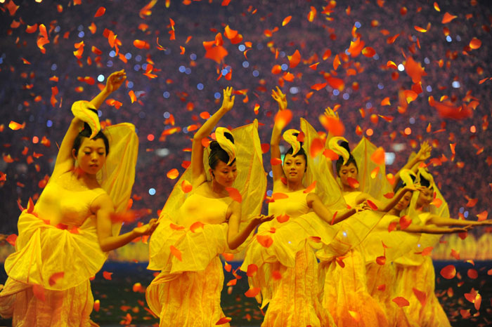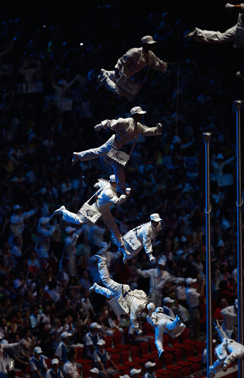 Dancers perform in the National Stadium, better known as the Bird's Nest, at the closing ceremony of the 2008 Beijing Paralympic Games in Beijing on September 17, 2008. China will bring down the curtain on a spectacular summer of sport during which it dazzled on and off the track, with the closing ceremony of the Paralympics.