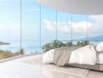 Panorama view bedroom 3d render, There are curve room with white floor, Furnished with white bed, There are large framless bay window overlooking to sea view.