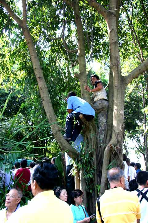 ประชาชนบางคนไม่มีที่นั่ง ต้องขึ้นไปนั่งบนต้นไม้ ภายในวัดสวนแก้ว