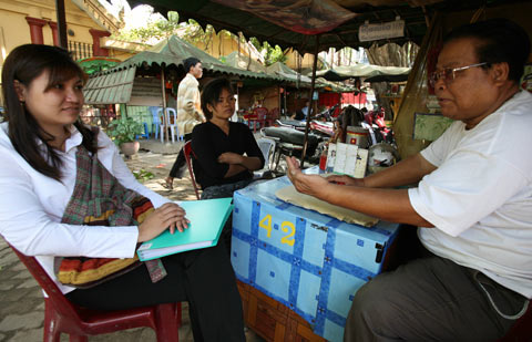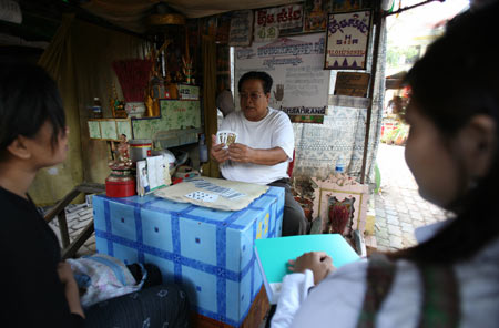ภาพถ่ายวันที่ 5 พ.ย.2550-- หมอดูสัมรางฮิม (Him Samrang) กำลังทำนายดวงชะตาของลูกค้าหญิงรายหนึ่งในเพิงที่บริเวณวัดพนม หมอดูคนนี้ก็มีชะตากรรมไม่ต่างกับคนอื่นๆ ปัจจุบันลูกค้าหายหน้าหายตาไปเกือบหมด (ภาพ: AFP)