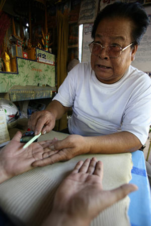 ก่อนนี้คนเชื่อกันว่าลายมือบอกโชคชะตา บอกอายุขัย สามารถทำนายล่วงหน้าไปจนถึงวันตาย ปัจจุบันชาวเขมรส่วนใหญ่ไม่เชื่ออีกต่อไป (ภาพ: AFP)