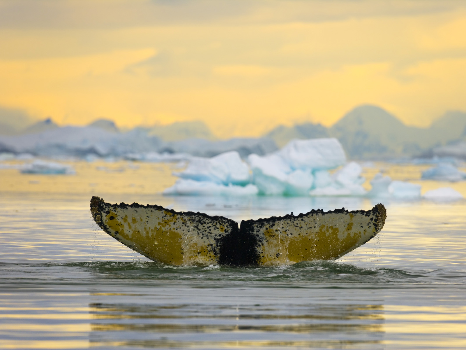 ocean-life-758Humpback whale tail with kayak, boat or ship, showing on the dive, Antarctic Peninsula, Antarctica
