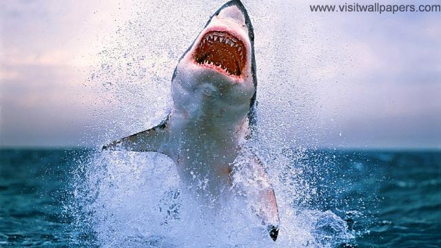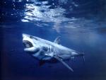 ocean-life-816Ocean shark bottom view from below. Open toothy dangerous mouth with many teeth. Underwater blue sea waves clear water shark swims forward