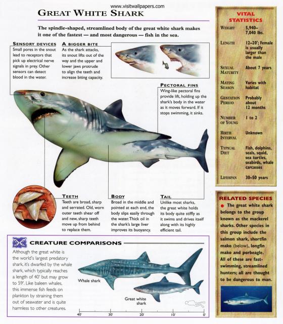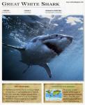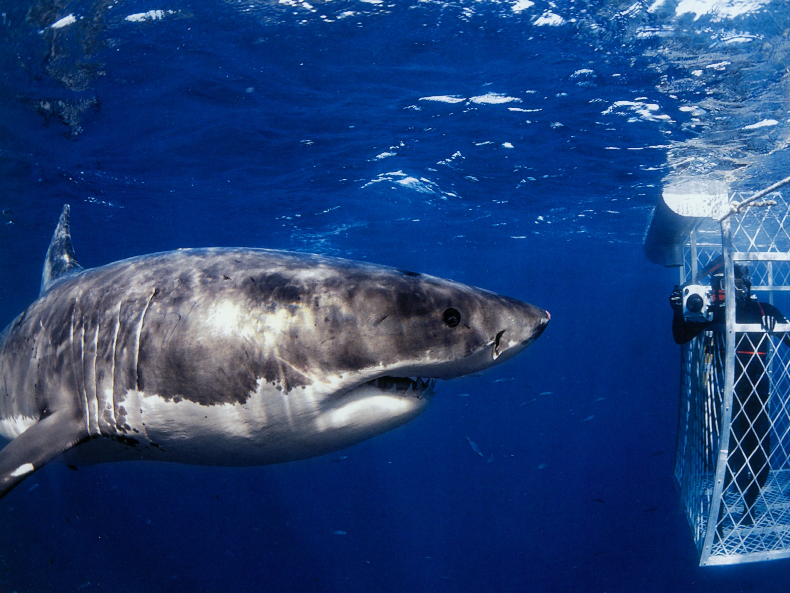 ocean-life-827Great White Shark swims near a diver in a shark cage, wearing a wetsuit and scuba gear, amidst ominous dark water.