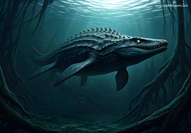 ocean-life-824A massive, serpentine plesiosaur, its scaly body undulating through the dark, mysterious waters, hunting in the depths of the sea, with piercing, glowing eyes fixed on its unsuspecting prey, set against a backdrop of eerie, primeval oceanic landscape, wit