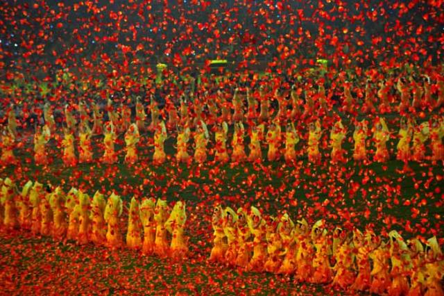 Dancers perform in the National Stadium, better known as the Bird's Nest, at the closing ceremony of the 2008 Beijing Paralympic Games in Beijing on September 17, 2008. China will bring down the curtain on a spectacular summer of sport during which it dazzled on and off the track, with the closing ceremony of the Paralympics.