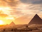 Landscape with Egyptian pyramids, Great Sphinx and silhouettes Ancient symbols and landmarks of Egypt for your travel concept to Africa in golden sunlight. The Sphinx in Giza pyramid complex at sunset.