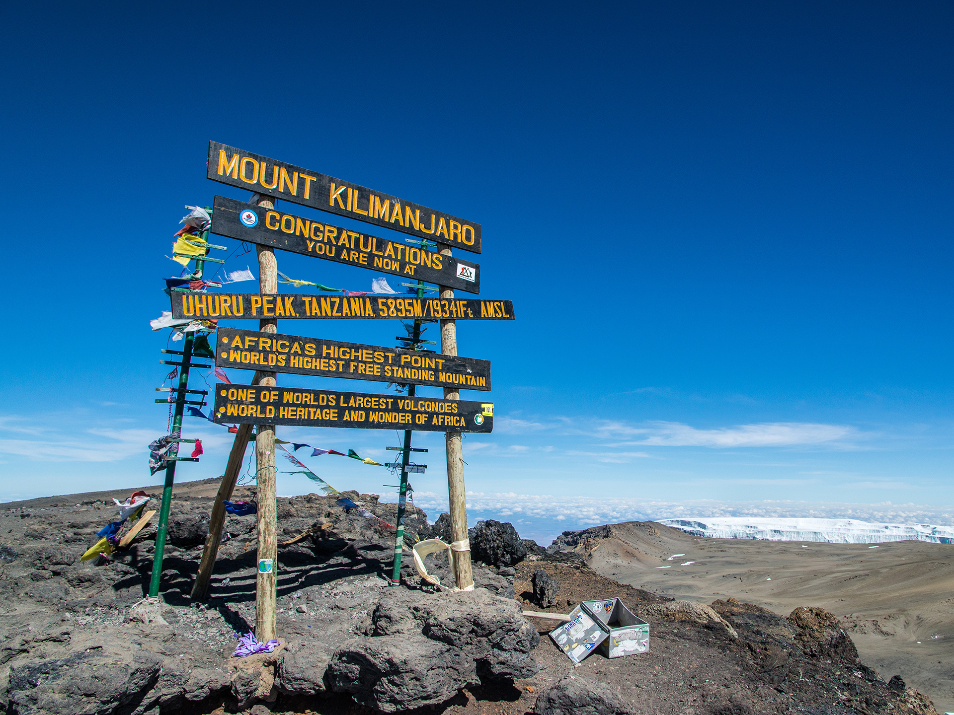 africa_141Stunning evening view of Kibo with Uhuru Peak (5895m amsl, highest mountain in Africa) at Mount Kilimanjaro, Kilimanjaro National Park, seen from Karanga Camp at 3995m amsl. Tents in the foreground.