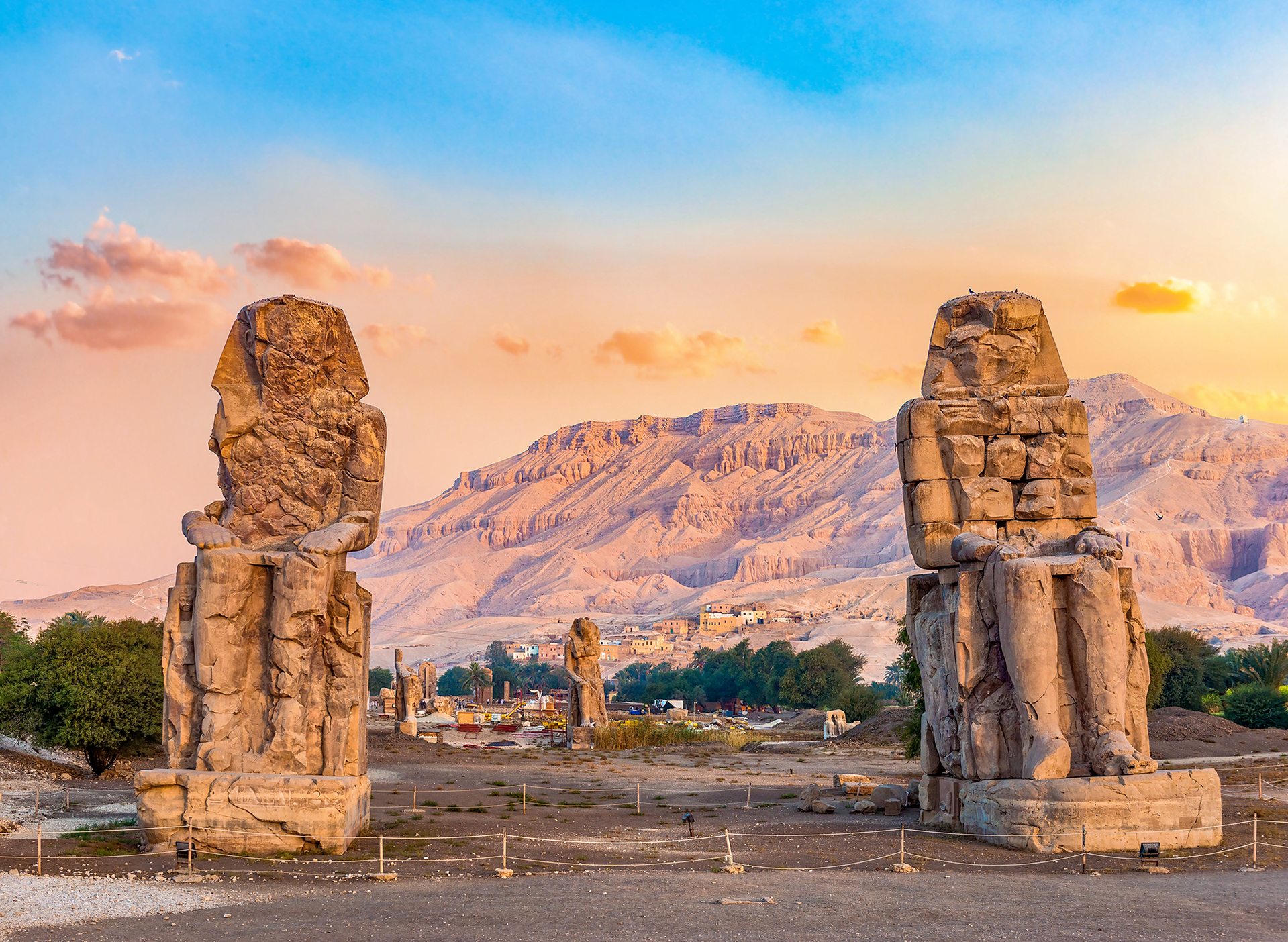 Sunrise over Colossi of Memnon in Luxor, Egypt