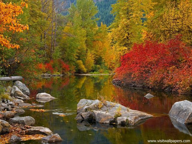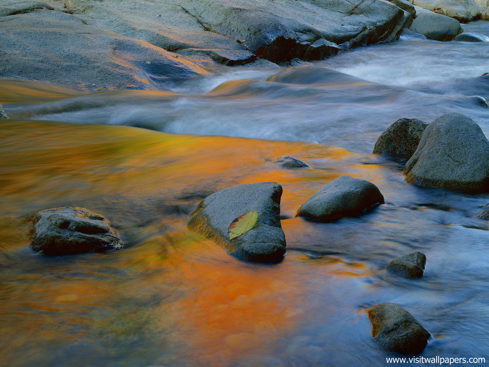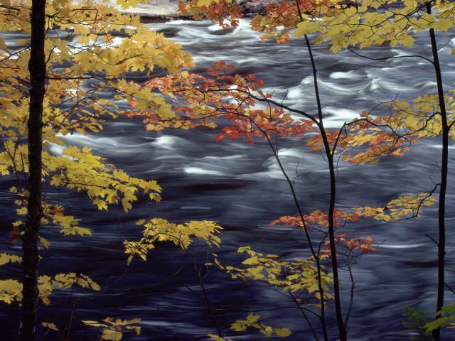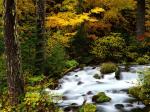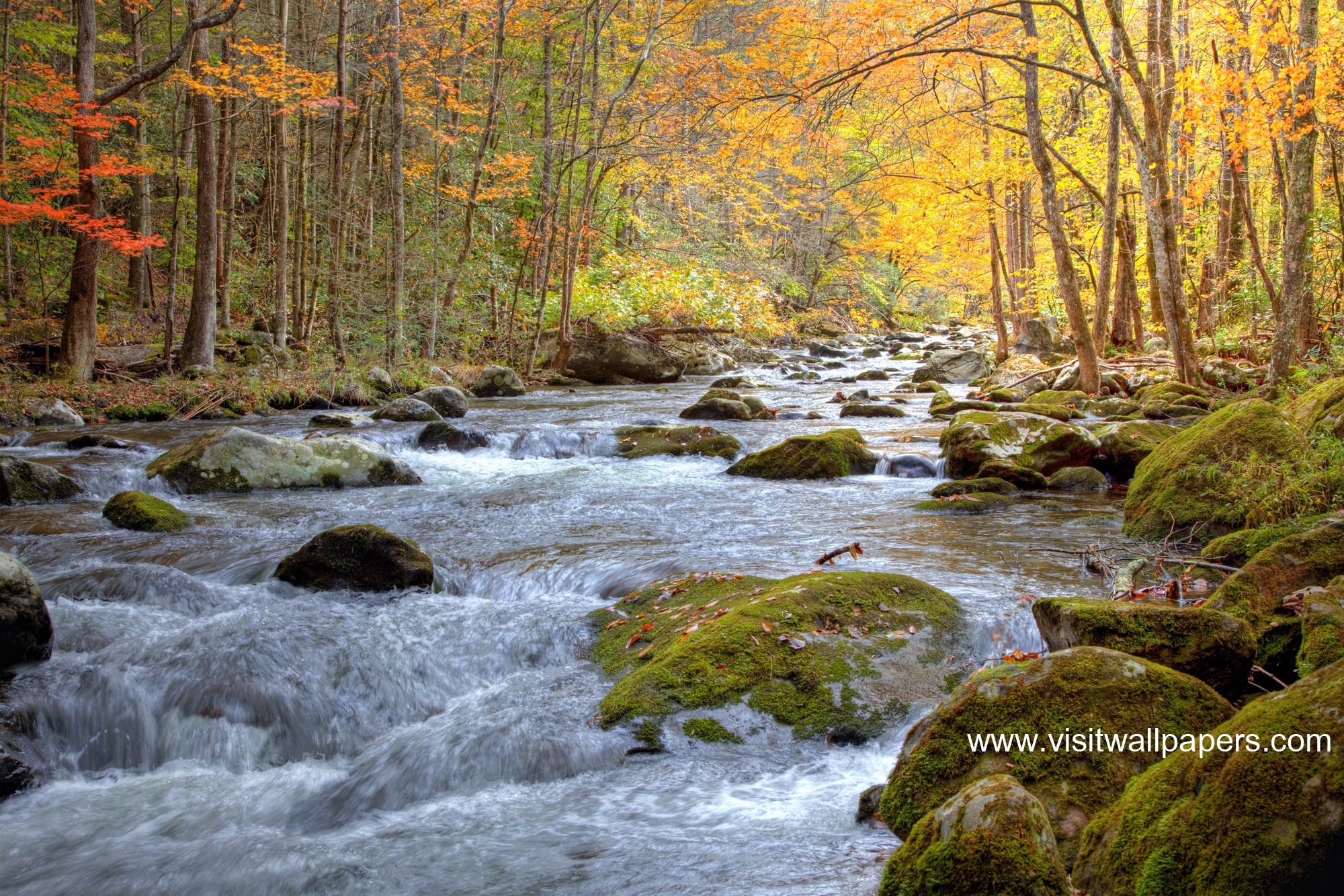 river_245Beautiful Smoky Mountain stream in the Fall season, showing golden, red and green trees lining the stream and rushing water with moss covered rocks.