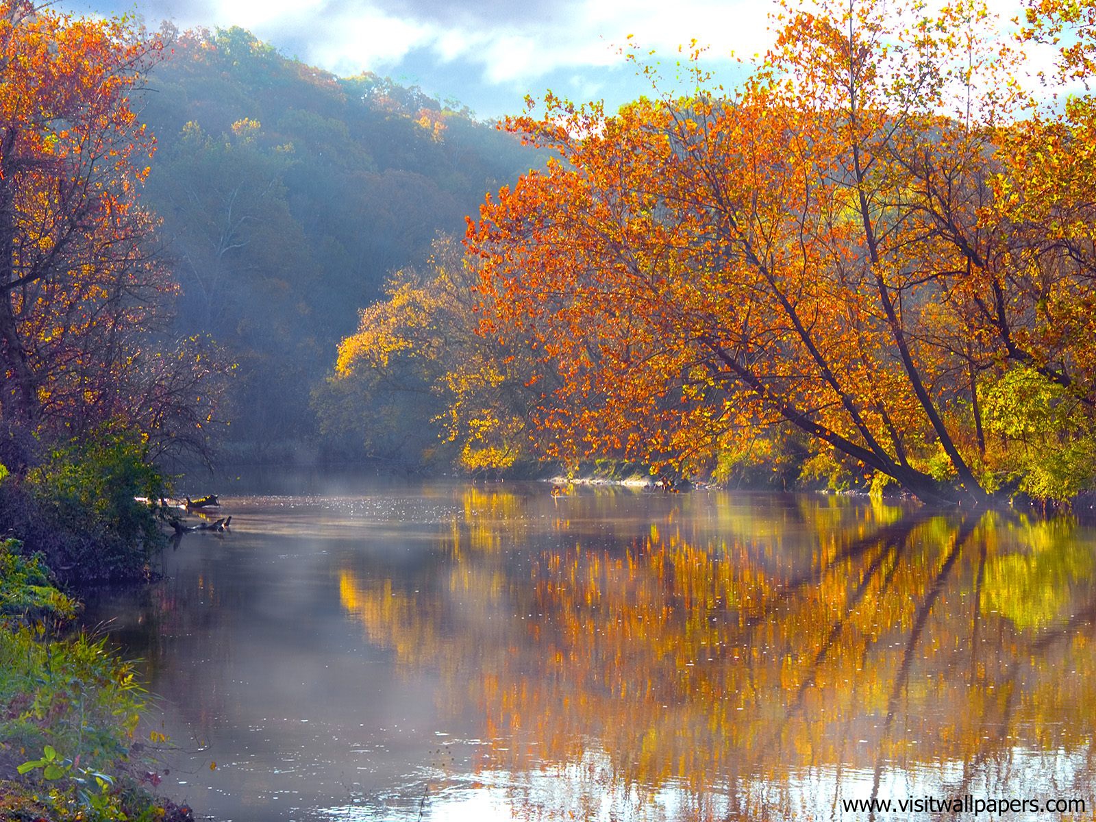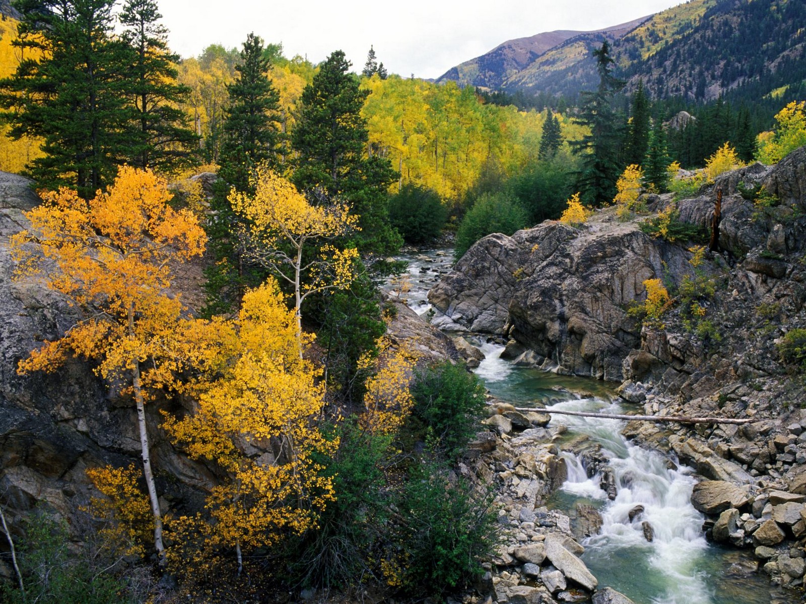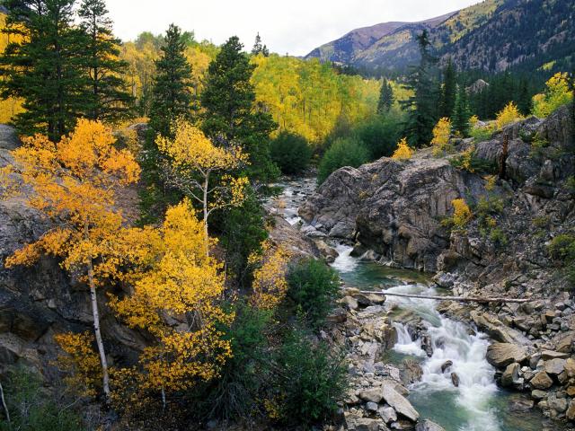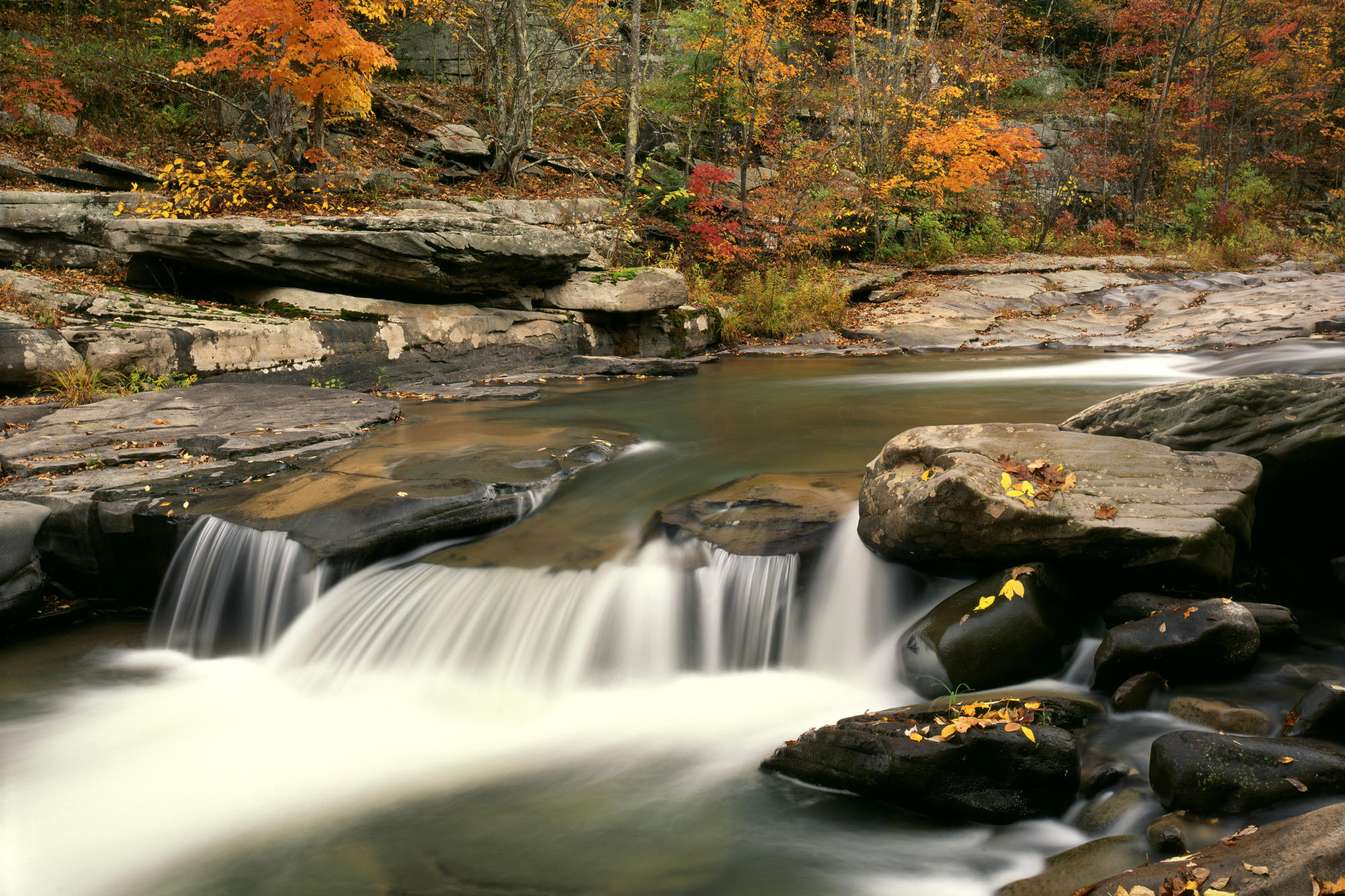 river_245Beautiful Smoky Mountain stream in the Fall season, showing golden, red and green trees lining the stream and rushing water with moss covered rocks.