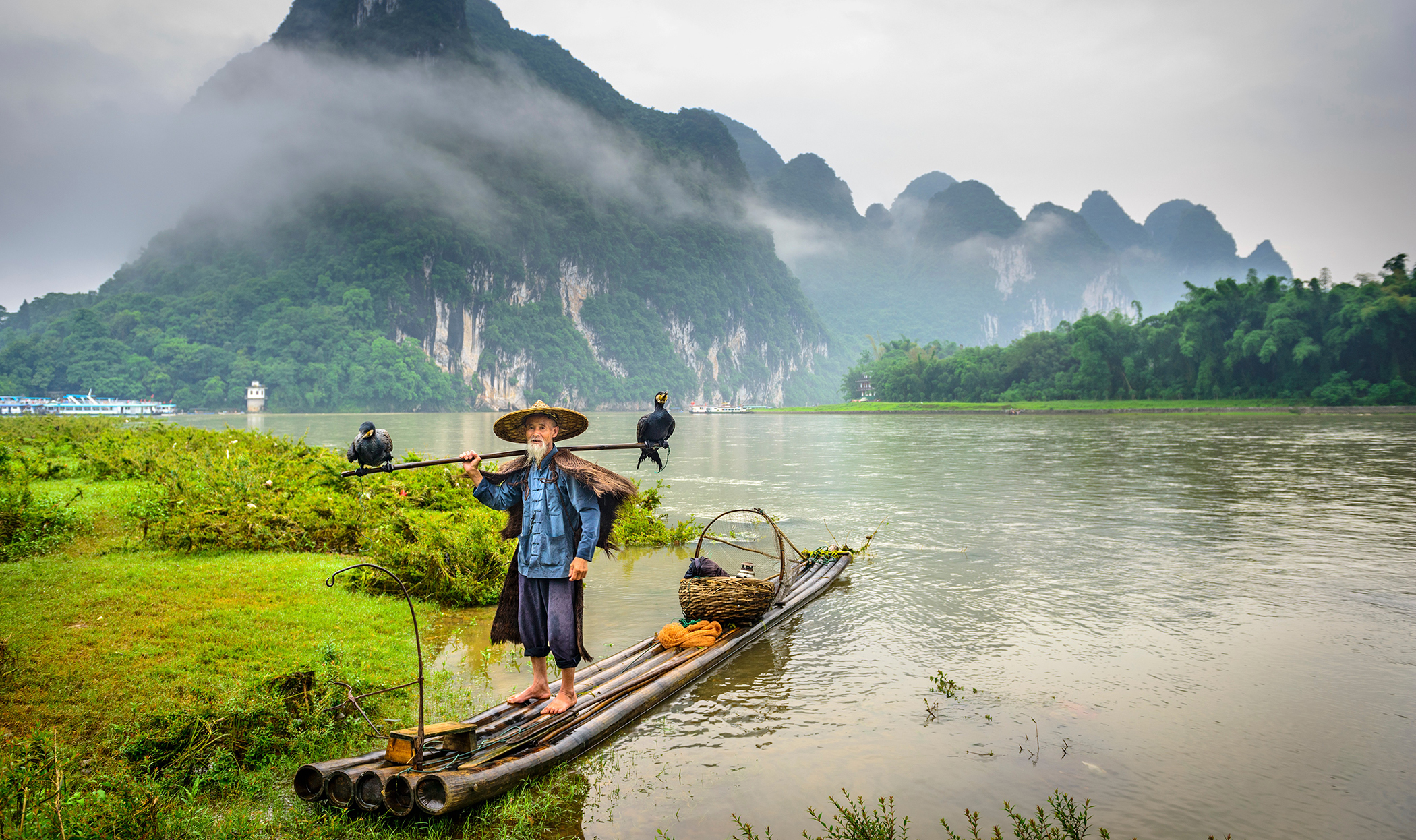 Cormorant fisherman and his birds on the Li River in Yangshuo, Guangxi, China