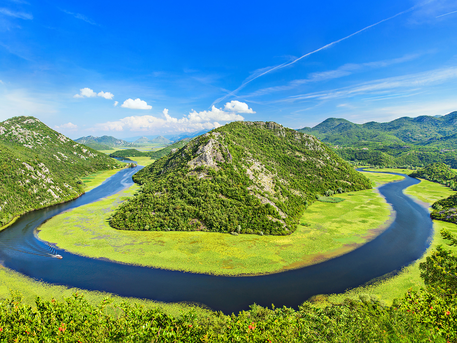 One of the most famous views of Montenegro. River makes a turn (loop) between the mountains and flows backward.