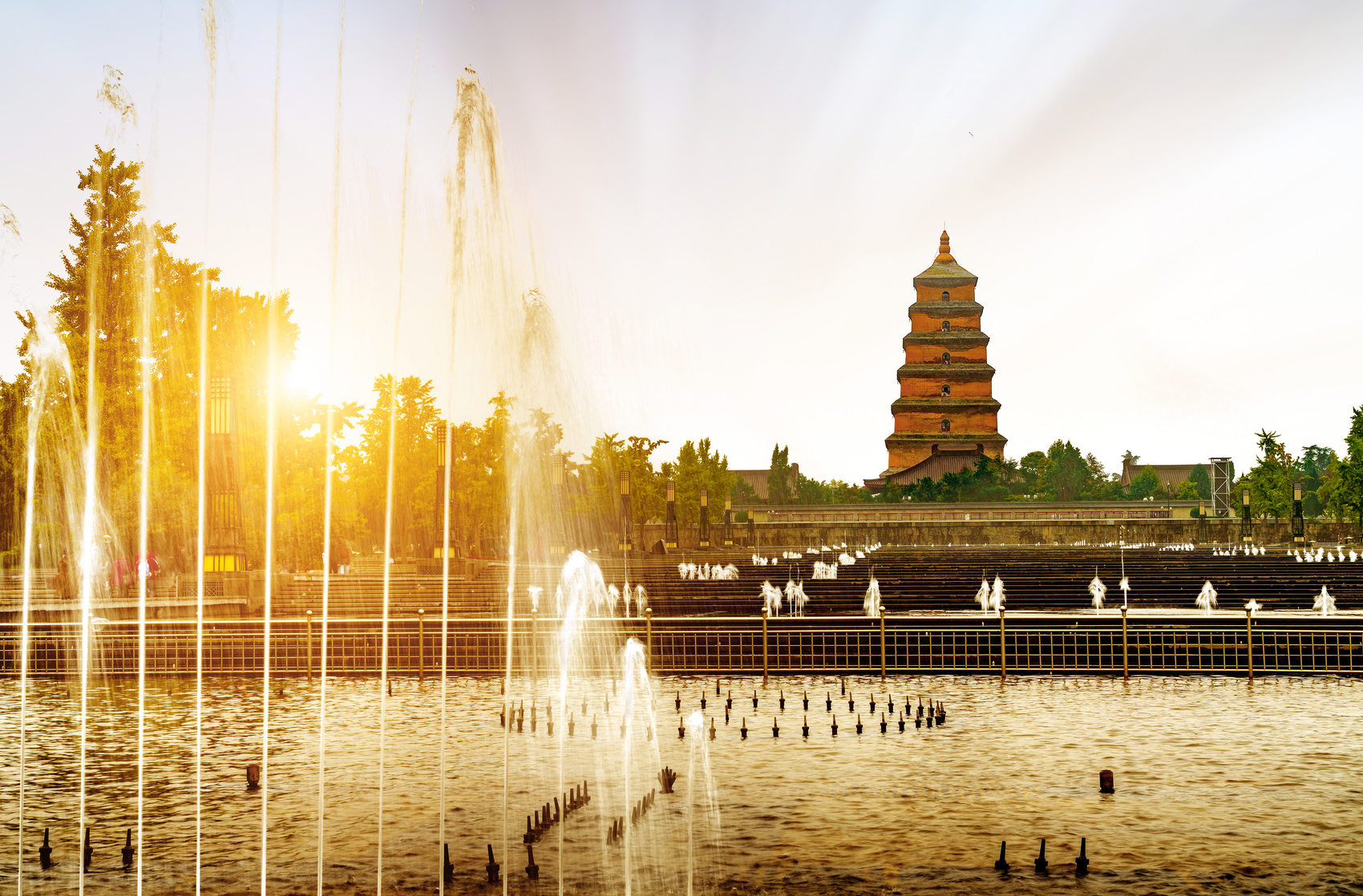 The pagoda was built from bricks, without using cement. Its distinctive façade was renovated during the Ming Dynasty and the building developed a perceptible lean to the left after an earthquake in 1556. A music fountain has been built in the north square and regularly hosts spectacular light and water shows.