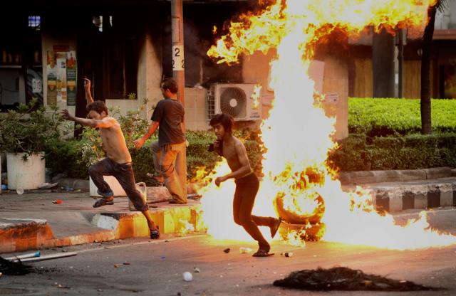 protests_043A Red Shirt protester throws a rock at a burning shopping mall on Wednesday, May 19, 2010. (AP Photo/Wason Wanichakorn)