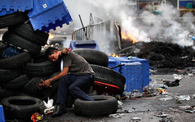 protests_018An intoxicated Red Shirt supporter lies against a barricade made out of tires during clashes at Rama IV Street in Bangkok May 16, 2010. (REUTERS/Jerry Lampen)