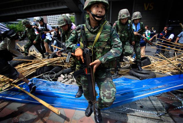 protests_028Thai soldiers make their way toward an anti-government barricade during a military crackdown Wednesday, May 19, 2010, in Bangkok, Thailand. (AP Photo/Wason Wanichakorn)