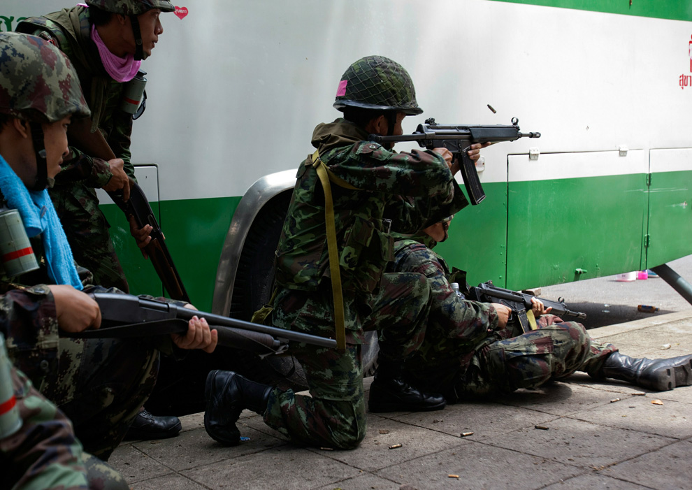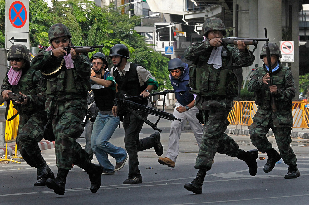 protests_037Thai security forces shoot towards Red Shirt protesters in their encampment on May 19, 2010 in Bangkok, Thailand. (Athit Perawongmetha/Getty Images)