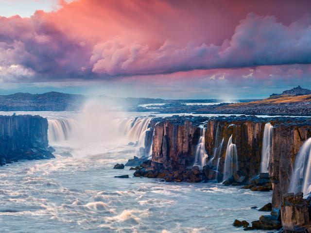 iceland_83Colorful summer landscape on Jokulsa a Fjollum river. Beautiful sunrise scene on the Selfoss Waterfall in Jokulsargljufur National Park, Iceland, Europe. Artistic style post processed photo.