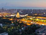 Beautiful sunset view of xian, famous big wild goose pagoda with city skyline, China