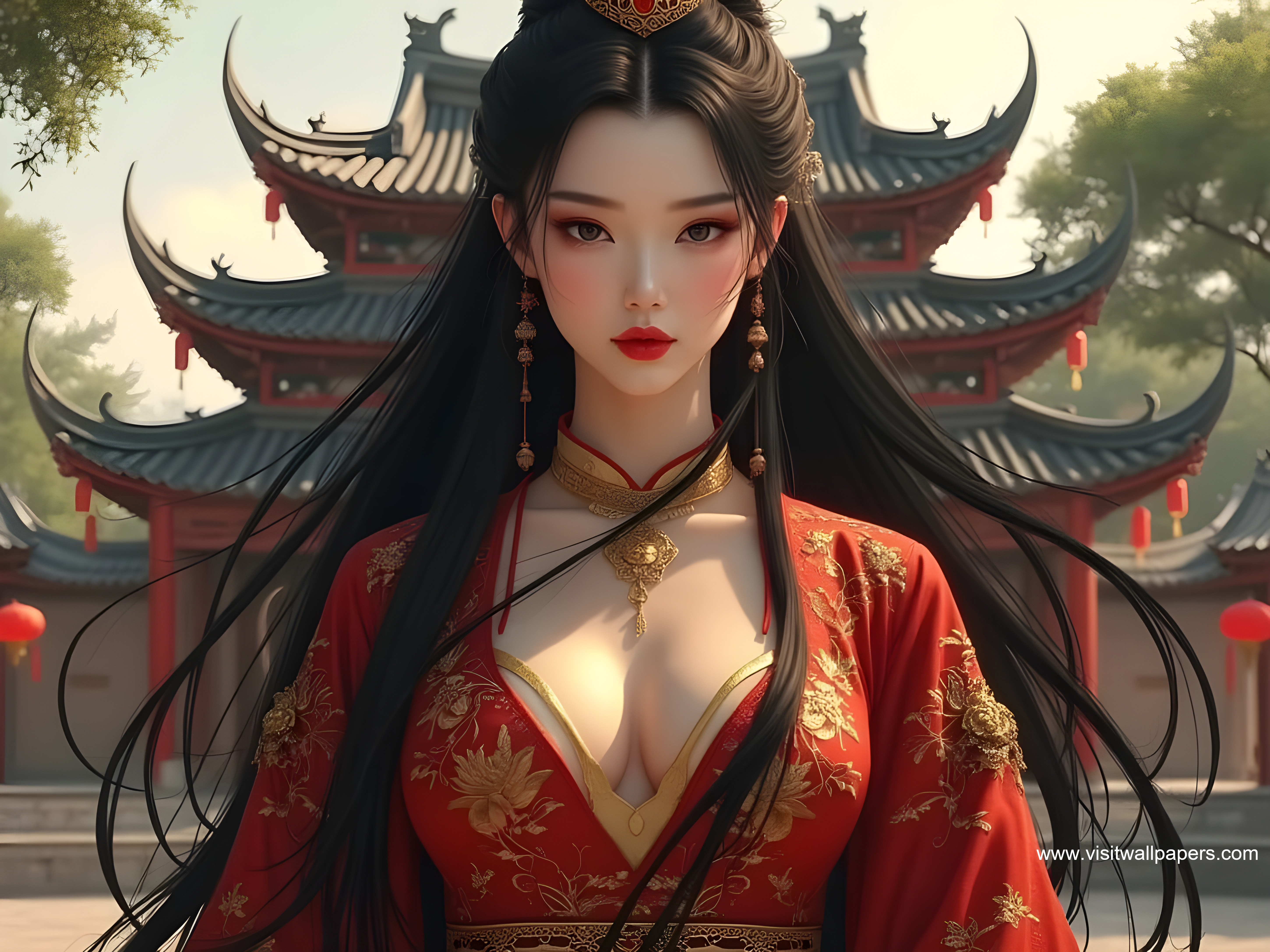 Regal ancient chinese female warrior with long black hair, set against a chinese temple with wispy trees, chinese lanterns and traditional chinese architecture in the distance.