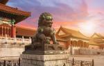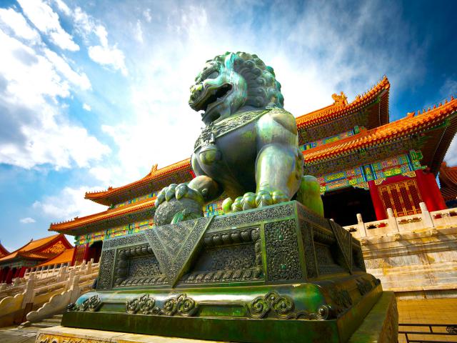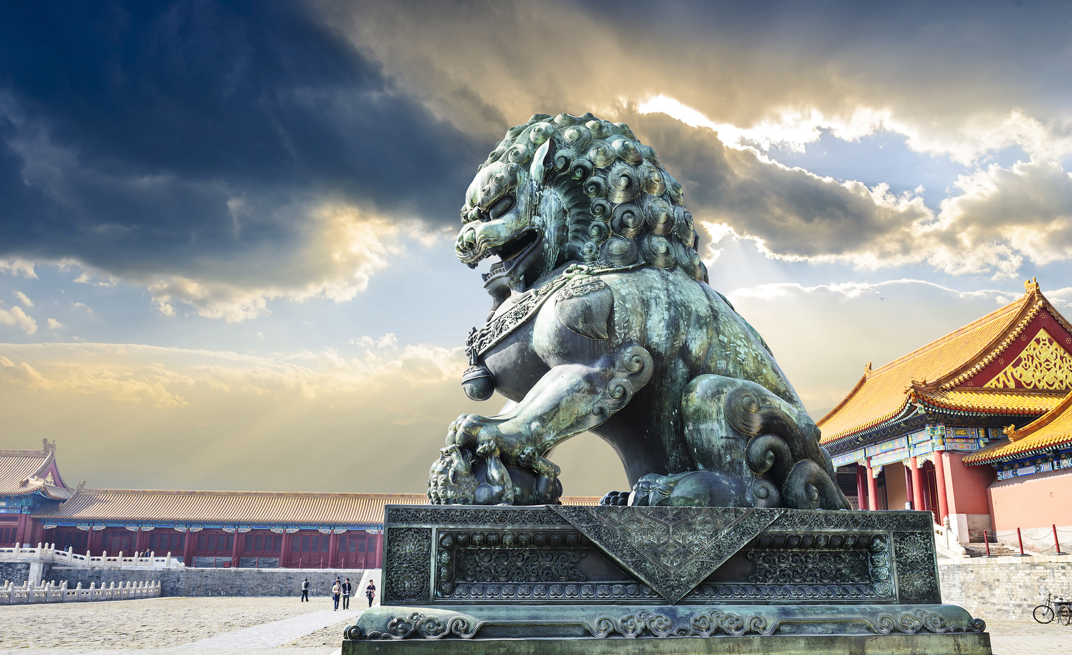 Bronze lion at the Forbidden City, Beijing, China. Chinese cultural symbols