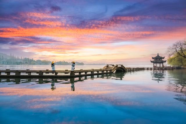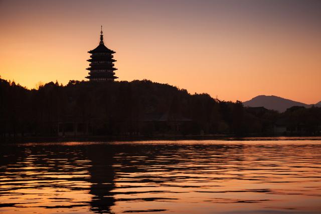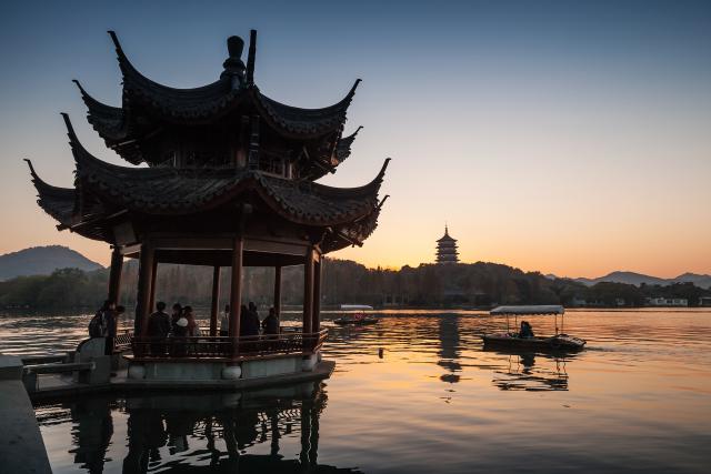 Jixian Pavilion at dusk, West Lake, Hangzhou, China