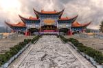 The Three Pagodas are located about 1.5 km (0.93 mi) north of Dali old town. They are at the east foot of the tenth peak of the massive Cangshan Mountains and face the west shore of the Erhai Lake of ancient Dali.