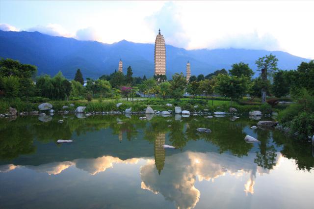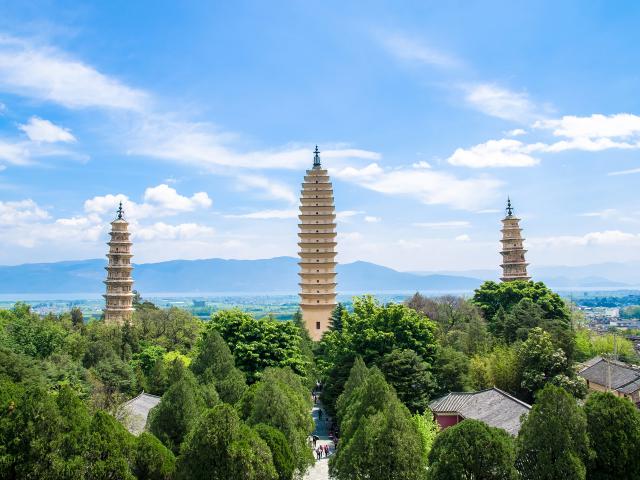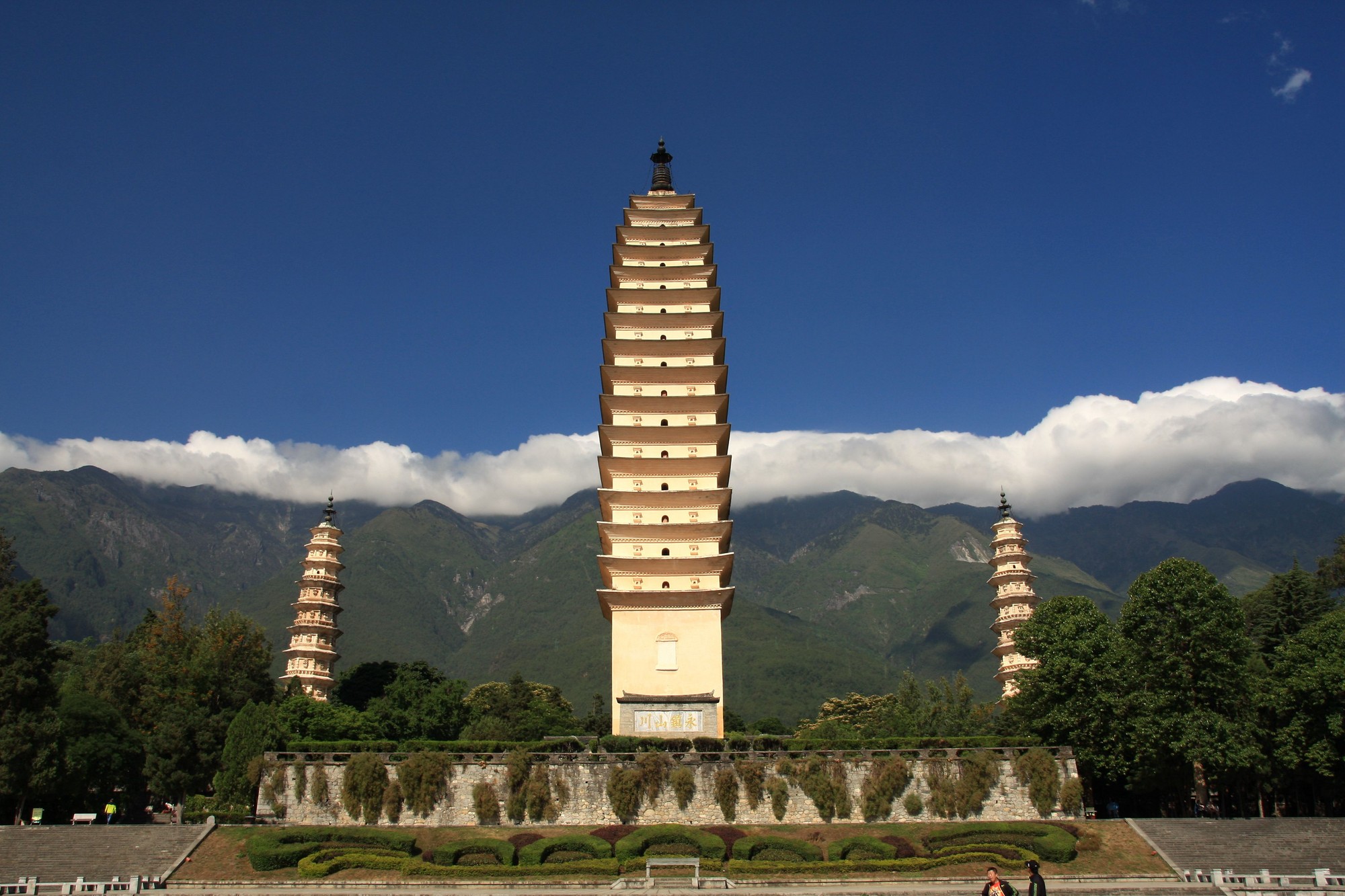 The Three Pagodas of the Chongsheng Temple (Chinese: 崇圣寺三塔; pinyin: Chóngshèng Sì Sāntǎ) are an ensemble of three independent pagodas arranged on the corners of an equilateral triangle, near the old town of Dali, Yunnan province, China, dating from the time of the Kingdom of Nanzhao and Kingdom of Dali in the 9th and 10th centuries.