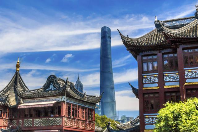 Beijing cityscape between ancient chinese architecture. historic buildings and Beijing modern building with sweet sky, Beijing, China