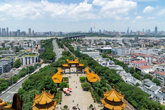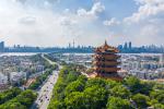 china_902Aerial view of Wuhan city. Panoramic skyline and buildings beside yangtze river. The yellow crane tower, located on snake hill in Wuhan, is one of the three famous towers south of yangtze river, China. 4 Chinese letters on tower is "Nang Xiong Gao