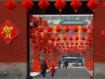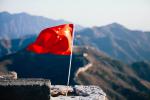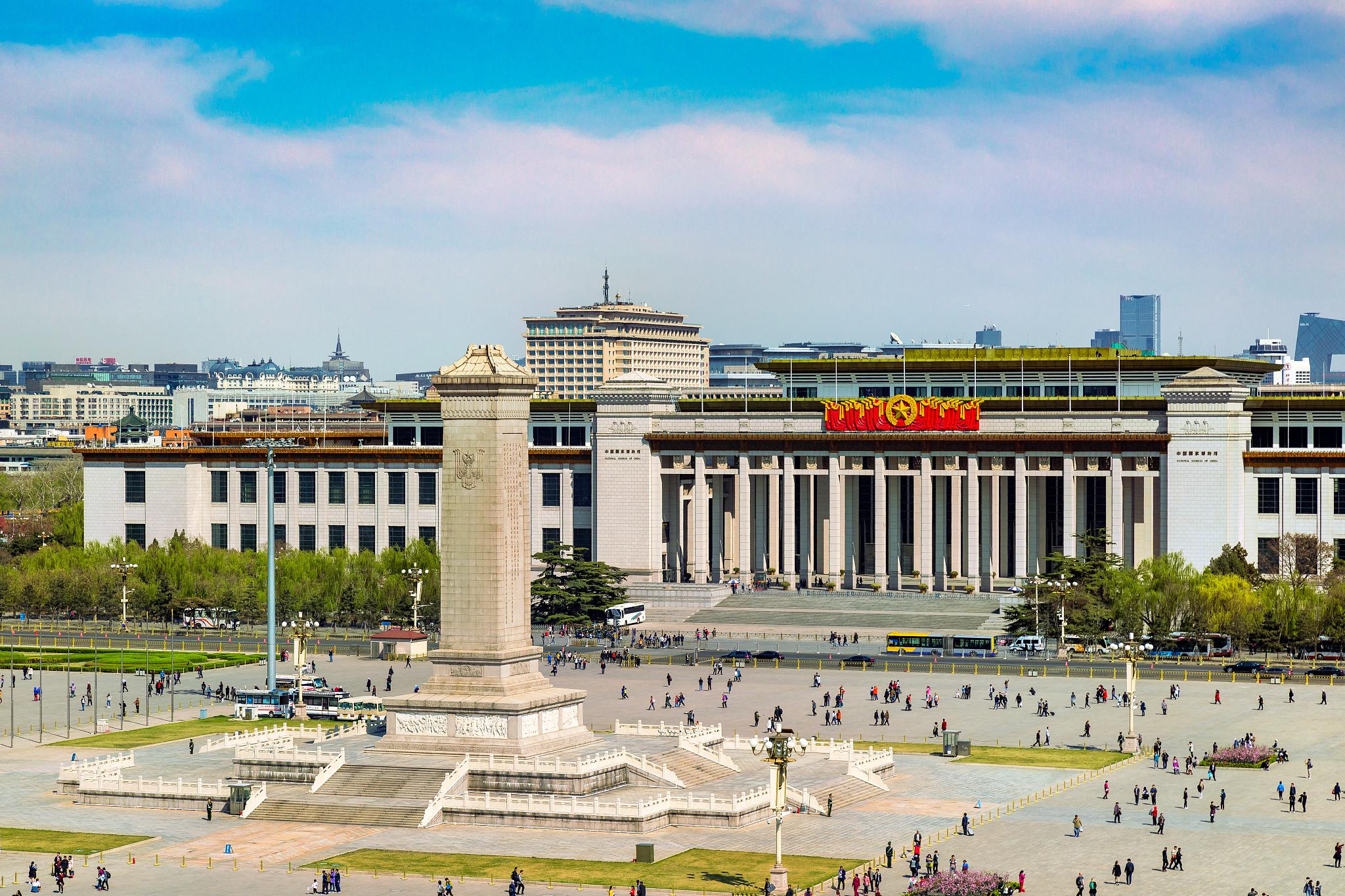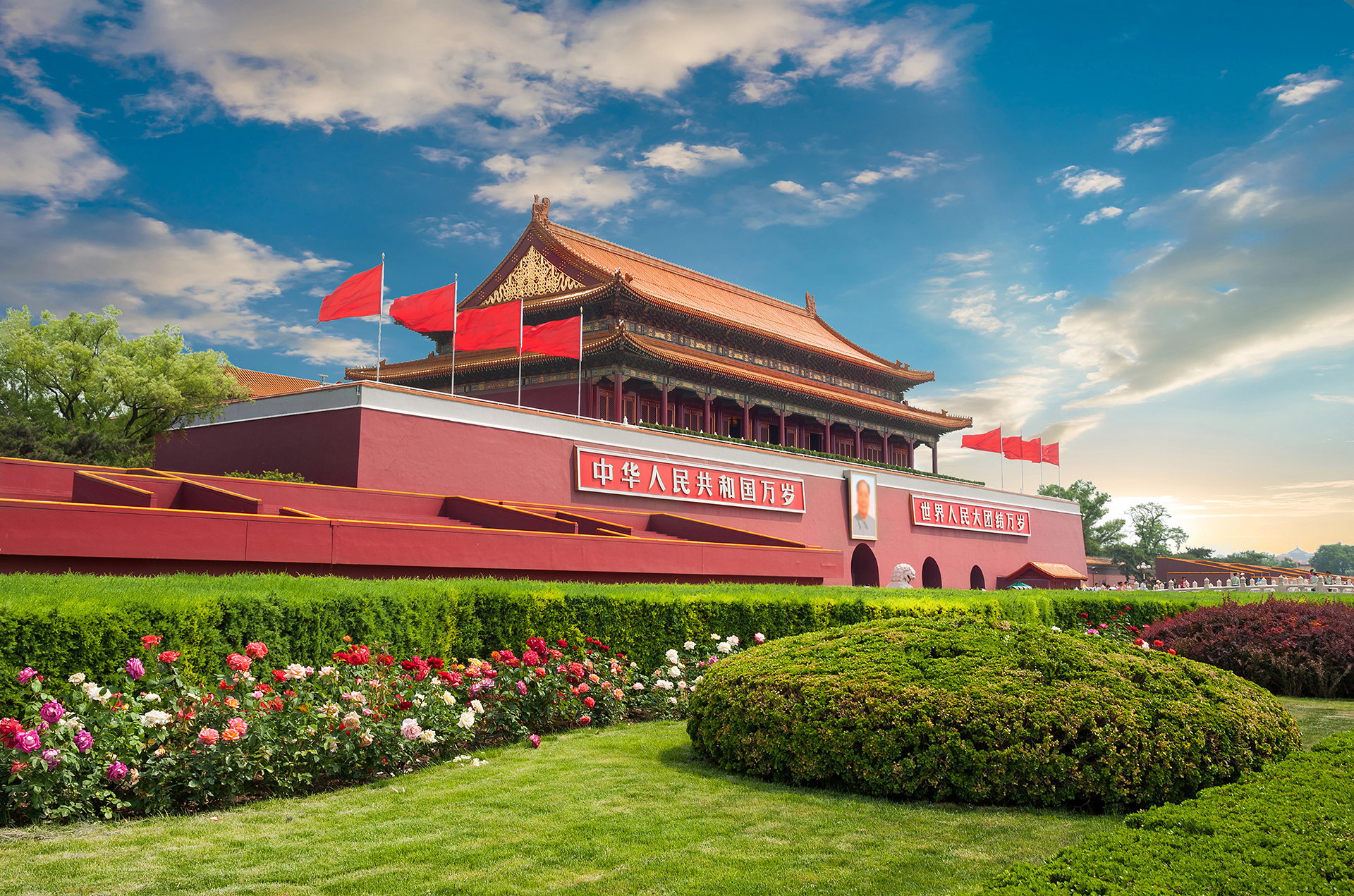 China Tiananmen gate with Great Wall in background. Chinese text on the red wall reads: Long live China and the unity of all peoples in the world.
