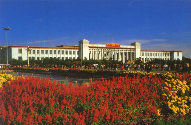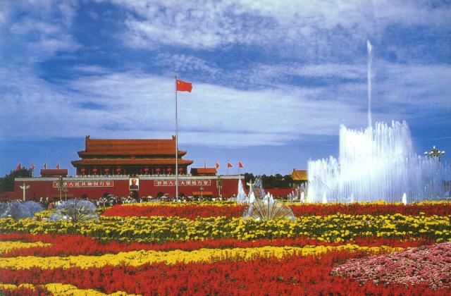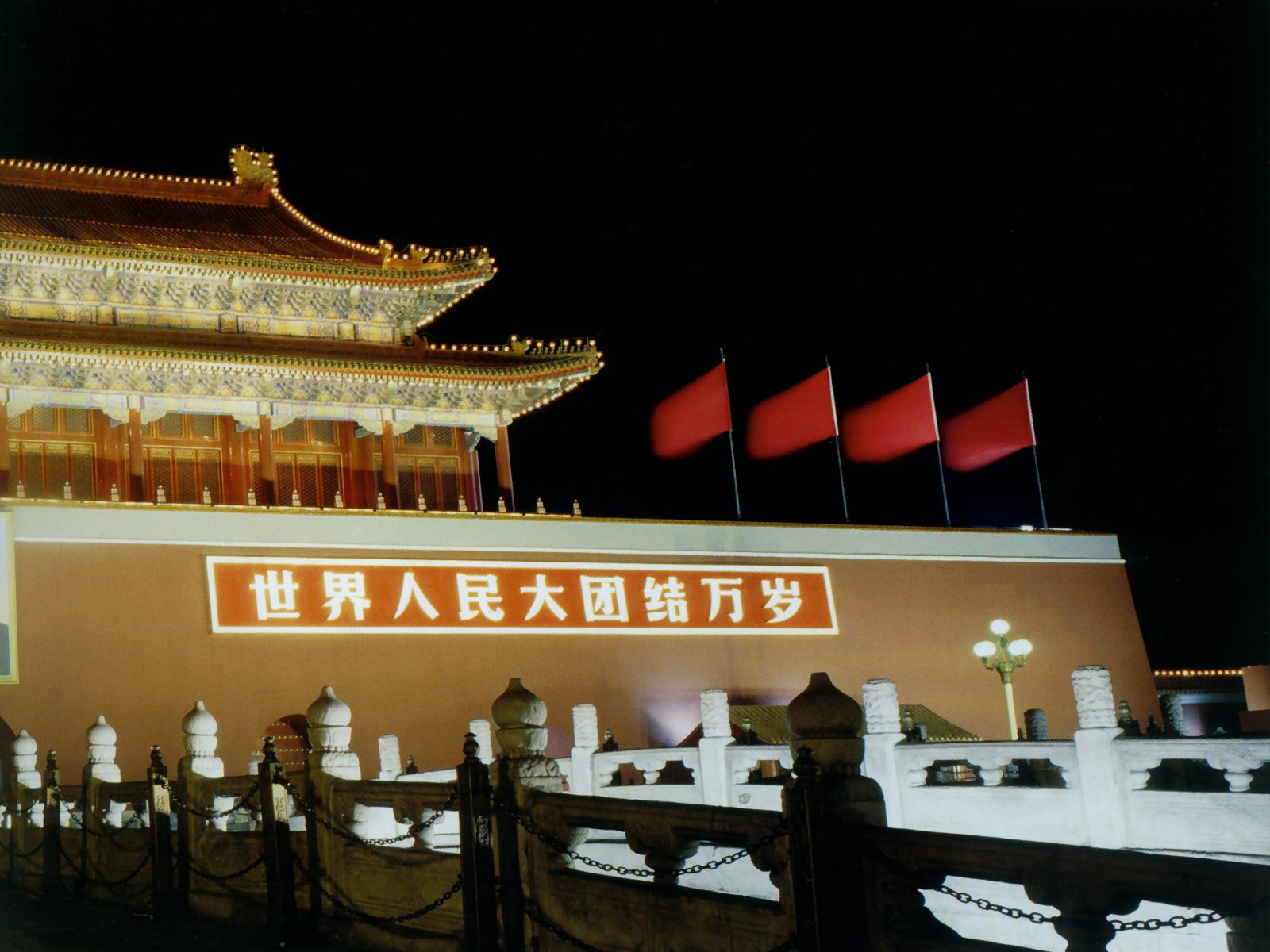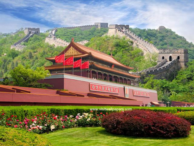 china_859China Tiananmen gate with Great Wall in background. Chinese text on the red wall reads: Long live China and the unity of all peoples in the world.