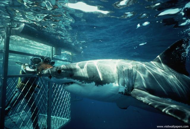 ocean-life-827Great White Shark swims near a diver in a shark cage, wearing a wetsuit and scuba gear, amidst ominous dark water.