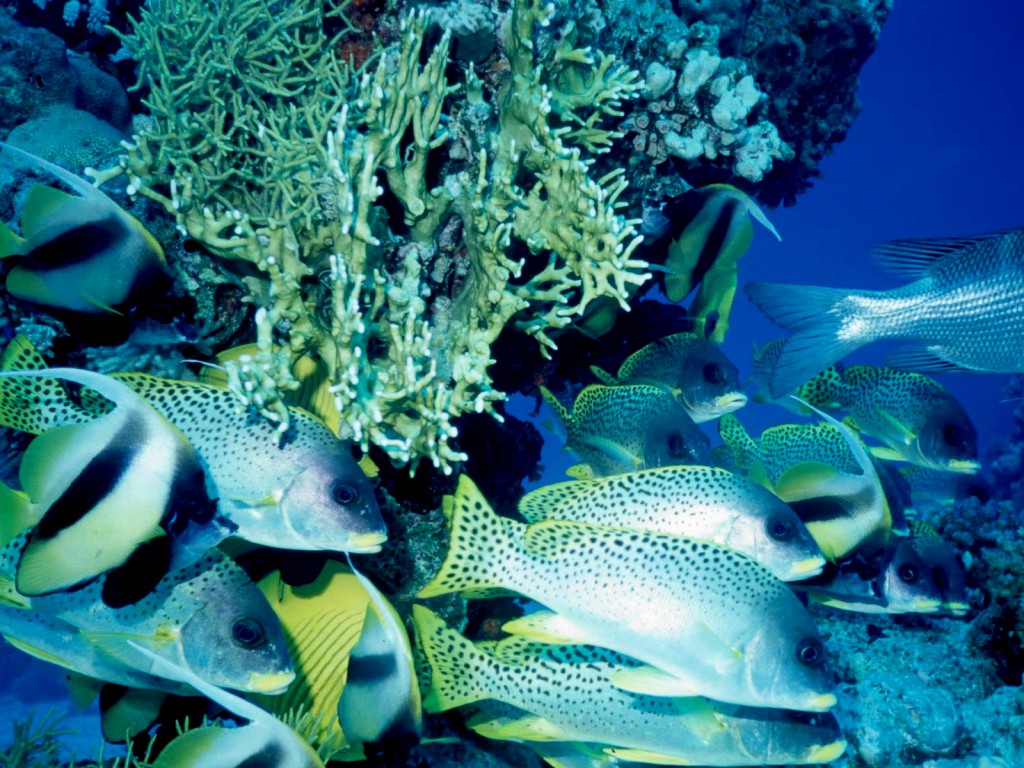 ocean-life-778Underwater coral reef scenery with colorful school of fish.