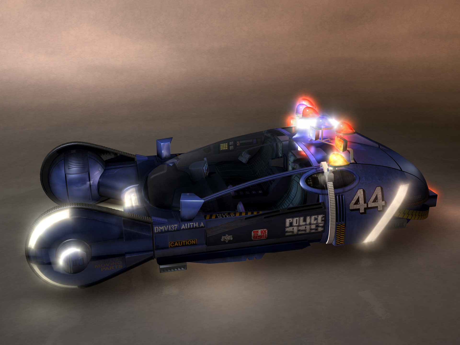 Spinner is a nickname for the type of Police flying car in Blade Runner that can drive as a ground car, take off vertically, hover and cruise using jet propulsion much like Vertical Take-Off and Landing (VTOL) aircraft today. They are used extensively by the police to survey the population, and its clear that despite restrictions wealthy people can acquire spinner licenses. It was designed by Syd Mead and has been replicated in films such as The Fifth Element and Star Wars prequel trilogy.