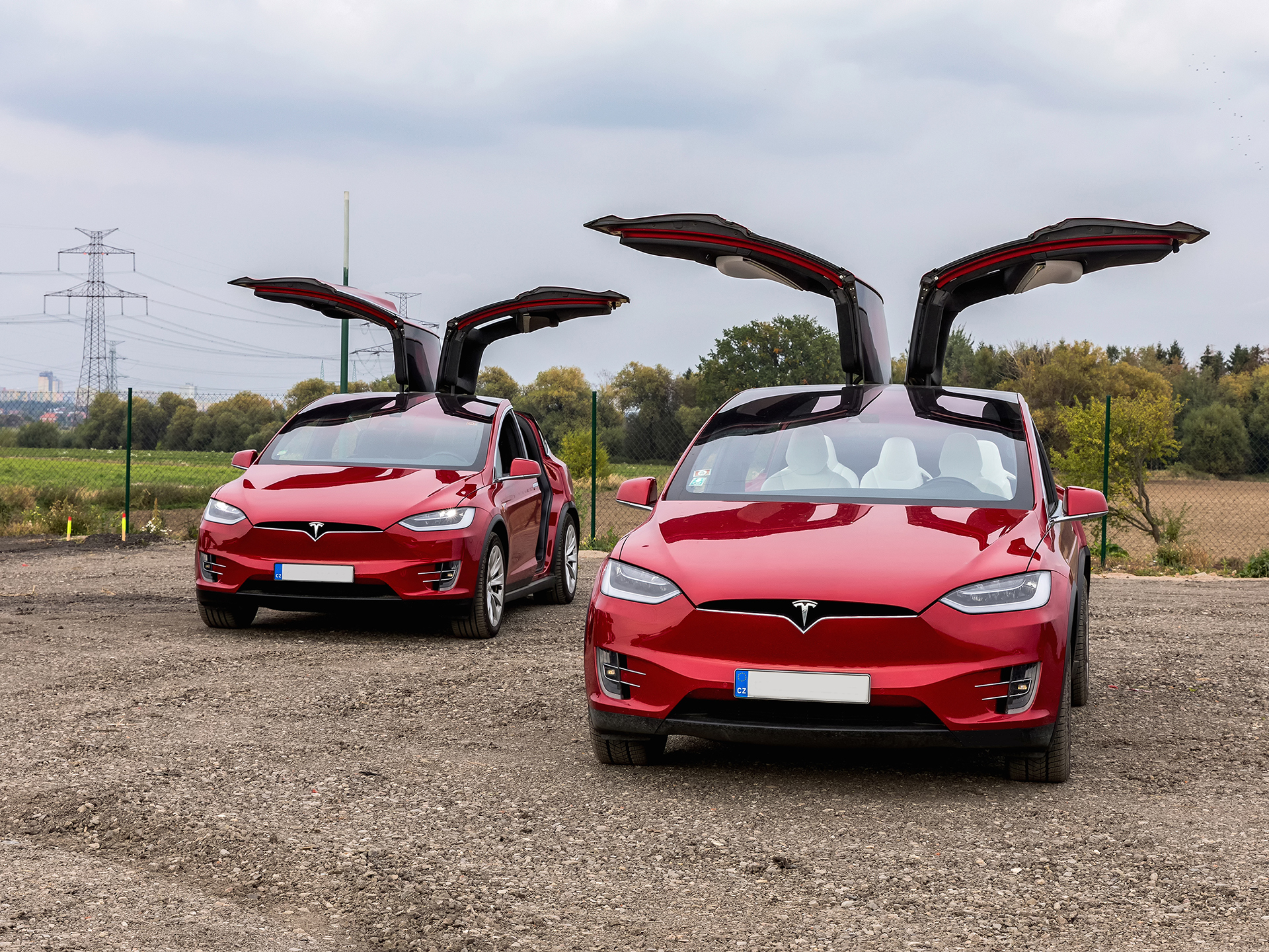 Cars_360PRAGUE, CZECH REPUBLIC - SEPTEMBER 23, 2017. Two red cars Tesla Model X with opened door. Tesla Model X on the scraper car park.