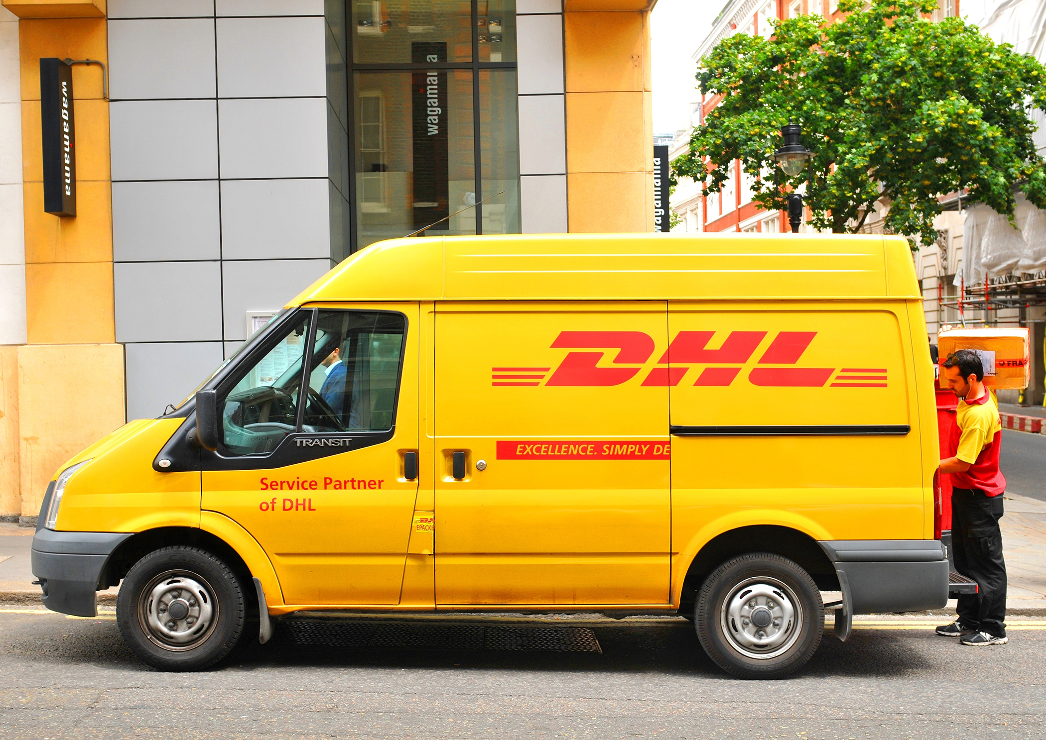 LONDON, UK - JULY 9, 2014: Carrier unloads DHL delivery service van in central London