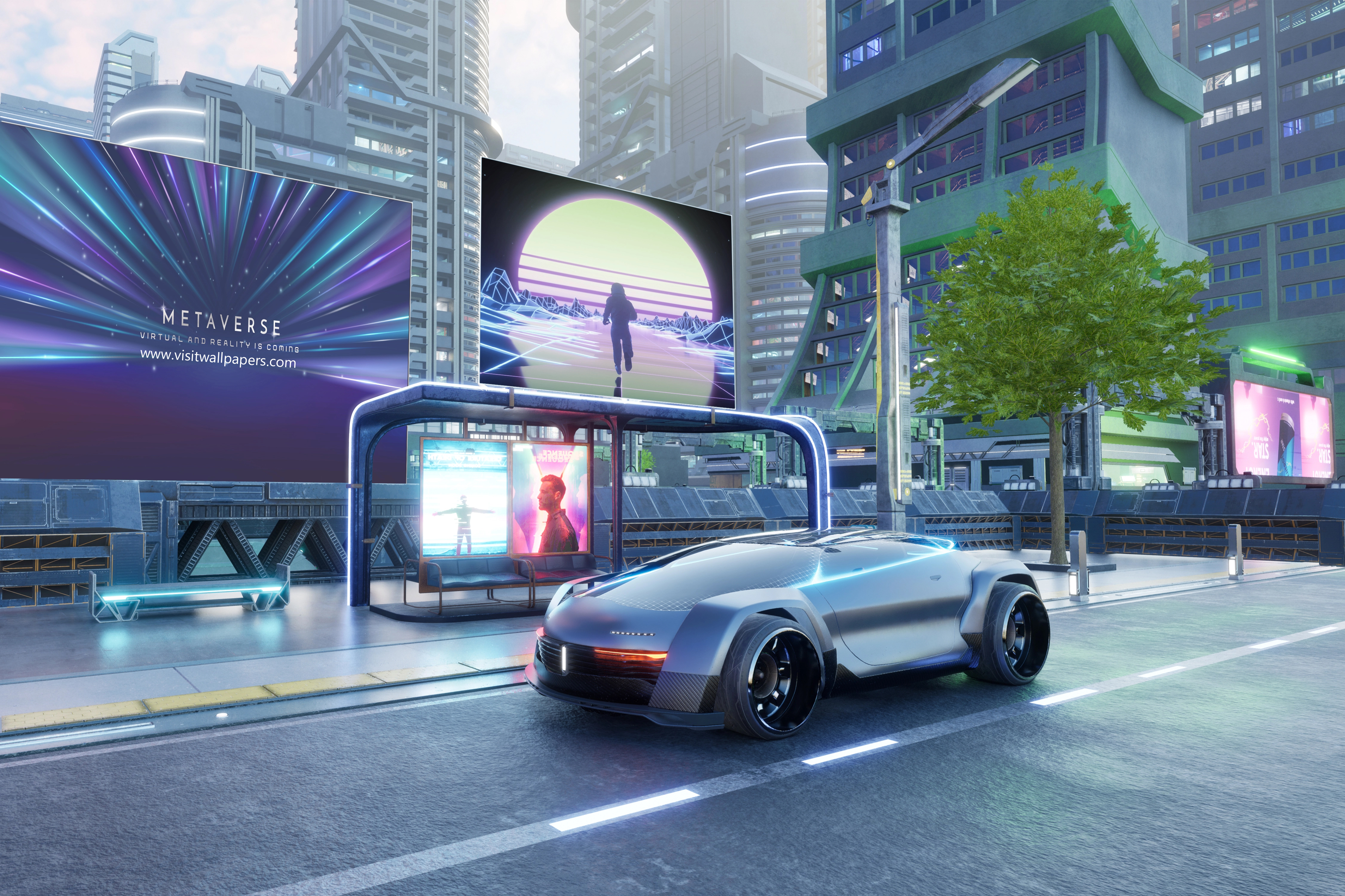 Autonomous electric sport car in smart city, metaverse or cyberpunk conpept, 3d render